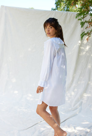 Our Clara Poet Nightdress will make you feel like your living in another time. So romantic and classic in 100% Cotton pure white lawn with a V-neckline ruffle with edge lace detail. The neckline is beaded with a Berry Velvet ribbon for a touch of holiday. The ruffle sleeves are elastic and are trimmed with lace as well as at the shirttail hemline.