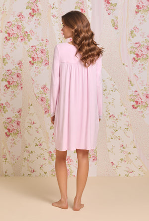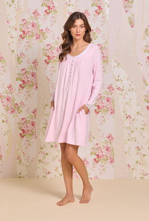 This soft sweater knit short nightgown is a staple for cold weather. Gorgeous 2" embroidered lace trims the V-neckline and sleeve openings. It is finished with stunning shirring details across the front yoke and an Akoya button placket.