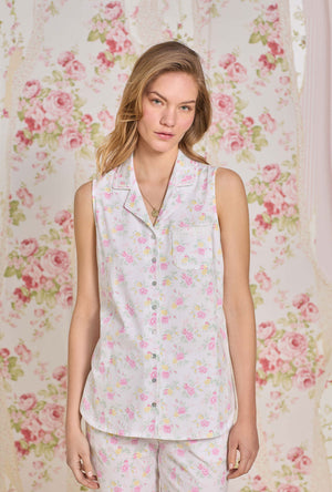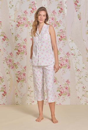 Elevate your night-time comfort with this cozy cotton jersey knit PJ set. The tunic style top features a notch collar trimmed with intricate venise floral lace that is beaded with a lovely satin ribbon. Other class design details include a front patch pocket embellished with embroidered lace and akoya round buttons down the front. The capri pants have an elasticized waist with a drawstring closure.