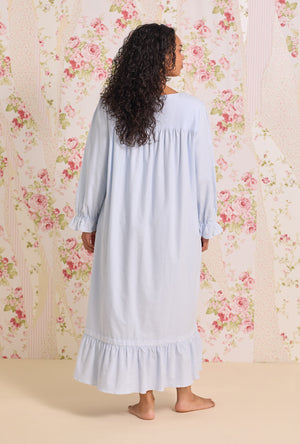 This soft 100% cotton flannel night gown is a staple for cold weather. It features a lace-trimmed sweetheart neckline, a placket of flower-shaped buttons, side seam pockets and elastic ruffled cuffs. The stunning floral embroidery on the yoke and above the ruffled hem makes this piece extra special.