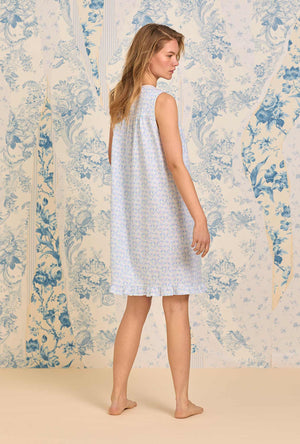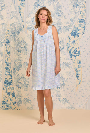 A dainty sleeveless chemise crafted in 100% cotton jersey knit. Features fresh eyelet edge lace along the sweetheart neckline. At the yoke vertical pintucking details embellished with beaded eyelet embroidered lace trim with a satin ribbon. Finished with Akoya floral buttons and a baby ruffled hem.