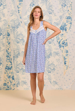 A sweet modal knit sleeveless chemise with venise floral lace edge trims along the the sweetheart neckline. The yoke is embellished with a venise floral lace button placket with akoya shell floral buttons and vertical pintucking details. Finished with a straight hem for a fun & flirty silhouette.