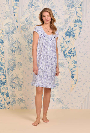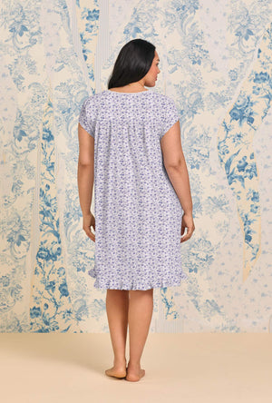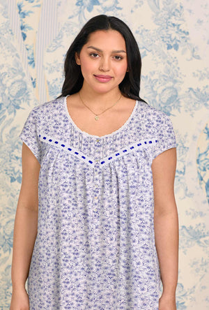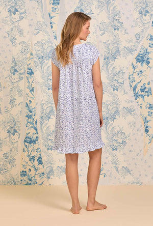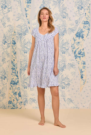 This short and sweet cap sleeve nightgown is crafted in 100% cotton jersey knit. This lovely style features fresh eyelet edge lace along the round neckline. At the yoke vertical pintucking details embellished with low beaded eyelet embroidered lace trim with a satin ribbon. Finished with Akoya floral buttons and a baby ruffled hem.
