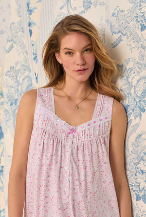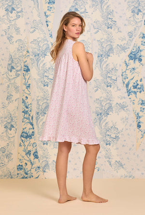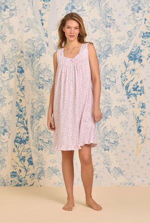A dainty sleeveless chemise crafted in 100% cotton jersey knit. Features fresh eyelet edge lace along the sweetheart neckline. At the yoke vertical pintucking details embellished with beaded eyelet embroidered lace trim with a satin ribbon. Finished with Akoya floral buttons and a baby ruffled hem.
