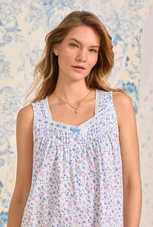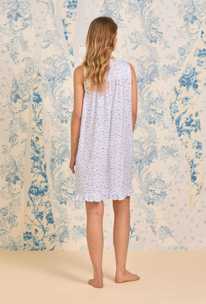 A dainty sleeveless cotton jersey knit short chemise. Features fresh eyelet embroidered lace trim along the sweetheart neckline. At the yoke vertical pintucking details embellished with beaded eyelet embroidered trim with a grosgrain notched ribbon. Finished with akoya floral buttons and a baby ruffle hem.