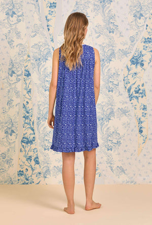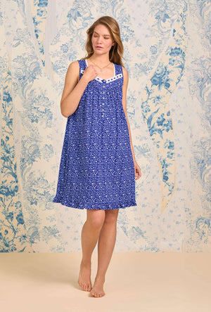 A dainty sleeveless cotton jersey knit short chemise. Features fresh eyelet embroidered lace trim along the sweetheart neckline. At the yoke vertical pintucking details embellished with beaded eyelet embroidered trim with a grosgrain notched ribbon. Finished with akoya floral buttons and a baby ruffle hem.