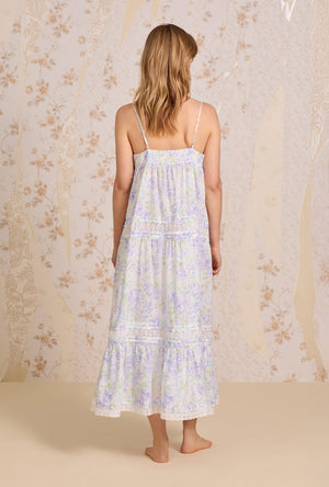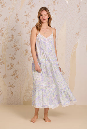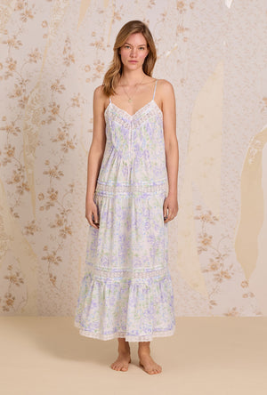 A new romantic strappy gown…made in our classic Cotton Woven Lawn. This gorgeous tiered nightgown features a sweetheart neckline embellished with venise floral lace that is beaded with a satin ribbon, that flows elegantly into intricate vertical pintucks. Features venise floral lace and pintucking details throughout the skirt tiers. Finished with a ruffled hem.