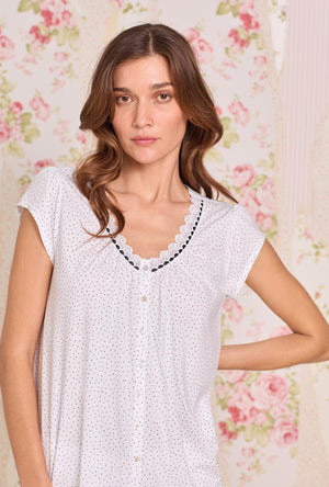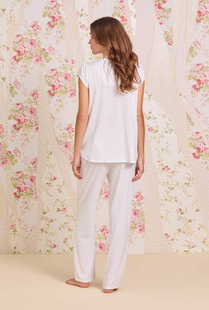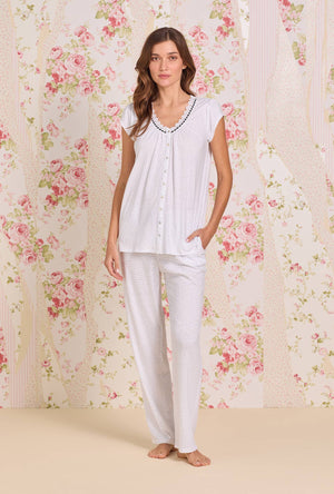 Made from soft 100% cotton jersey knit, this cap sleeve long pant set is as easy to wear as it is lovely to behold. A romantic V-neckline is framed with floral beaded Venise lace, delicately beaded with satin ribbon for a soft, luminous touch. Cap sleeves are softly shirred at the shoulder, adding a romantic flutter, while gentle gathers along the neckline create a relaxed, graceful drape. A trail of delicate flower-shaped Akoya shell buttons lends a sweet, vintage feel. Paired with a full-length pant featuring in-seam pockets and a soft drawcord waist, this set is a perfect blend of comfort and timeless charm.