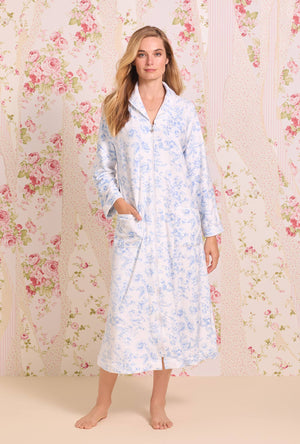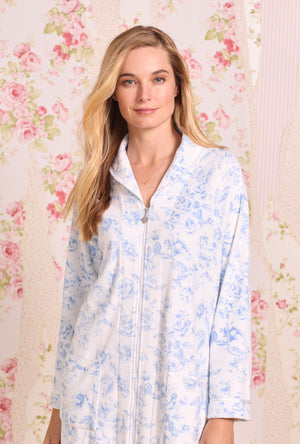 This cozy long sleeve zip robe is designed with double sided velour. Accented by satin binding details along the collar band, sleeve band, and patch pocket opening. Finished with full zipper with EW logo zipper pull, and two front patch pockets.