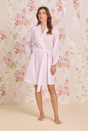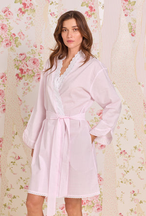 Woven from airy 100% Cotton Lawn, this charming wrap robe is soft, weightless, and delightfully textured. A wide band of eyelet lace edged with a playful mini check bias ribbon frames the neckline, adding a cheerful touch of pattern and whimsy. Gentle bias ruffles trim the sleeve cuffs, while scalloped eyelet lace traces the hem for a delicate finish. Complete with a set-in belt and handy in-seam pockets, this piece is perfect for layering over your favorite nightgown capturing the lighthearted grace of carefree mornings and tender moments at home.