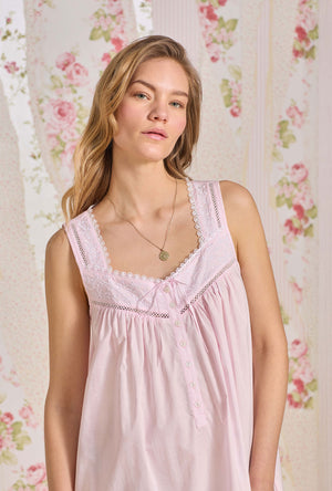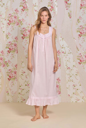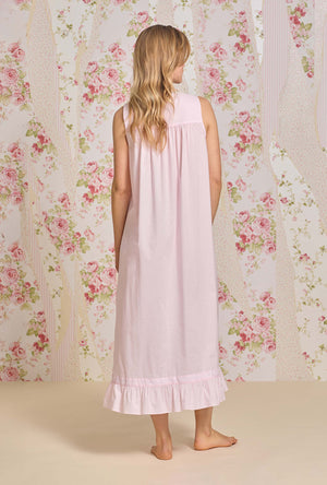 This sleeveless ballet nightgown is designed with delicate edge lace trims along the sweetheart neckline that is beaded with a satin ribbon at the center. It has stunning floral embroidery details and vertical pintucking at the yoke. Finished with round akoya shell buttons and floral embroidery details above the ruffled hemline. Crafted in our featherweight 100% cotton woven lawn.