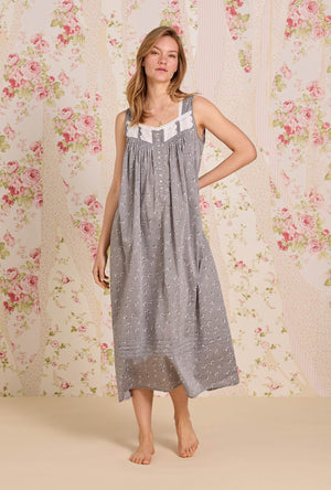 This timeless "Eileen" ballet nightgown is made from our best cotton yarn dye chambray. Fresh eyelet lace trims the sweetheart neckline. The button placket is complete with eyelet lace inserts, vertical pintucking details, and round Akoya shell buttons. Finished with a straight hem.