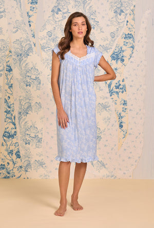 Soft and flowing in Tencel™ Modal Spandex jersey knit, this waltz nightgown carries a gentle, feminine ease. The sweetheart neckline is framed with floral Venise lace, paired with fine pintucks and soft shirring across the yoke for graceful texture. Delicate self ruffles trace the shoulder, neckline, and hem, while cap sleeves lend a light, romantic touch. Finished with a simple button-and-loop closure, it’s a quietly charming piece for unwinding in comfort.