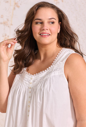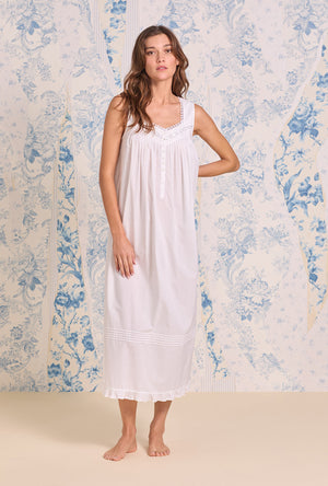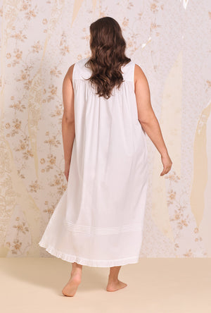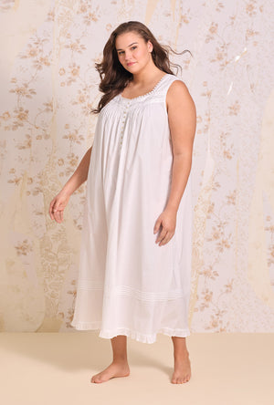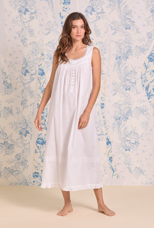 Woven from soft 100% cotton lawn , this classic “Eileen” ballet nightgown is light as a whisper and tender against the skin. A romantic sweetheart neckline is framed with floral beaded Venise lace, delicately beaded with satin ribbon and finished with gentle pintucks across the yoke. The sleeveless silhouette offers effortless comfort, while a row of luminous Akoya shell buttons adds a touch of vintage charm. Finished with delicate pintucks above the hem and scalloped lace trim, this piece captures the enduring beauty of softness and timeless design.