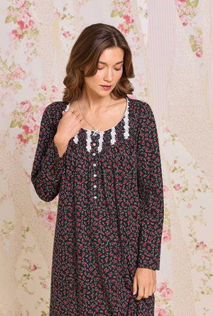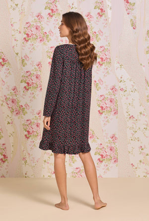 A whisper of softness, this short nightgown is crafted in 100% Cotton Peached Jersey, perfect for a restful evening. A rounded neckline adorned with floral Venise lace, pinched pleats, and a lovely satin center bow evokes quiet beauty. The button placket is designed with floral Akoya buttons. Finished with a ruffled hem for an added touch of grace.
