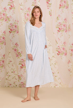 A cloud-soft embrace, this long sleeve waltz nightgown is crafted in our ever-so-soft Dream Fleece. Long sleeves and a rounded neckline trimmed with edge lace details evoke quiet grace. The yoke placket is adorned with low beaded floral Venise lace with a satin ribbon, delicate pintuck details, and floral Akoya buttons. Side seam pockets and a straight hem complete this nightgown, inviting softness and comfort into every serene moment.