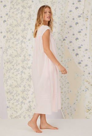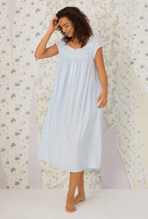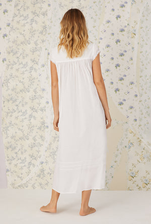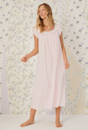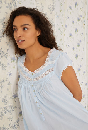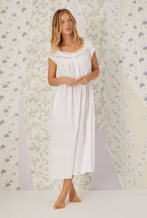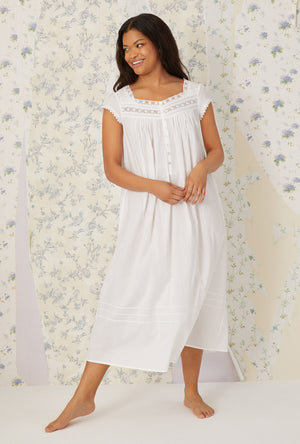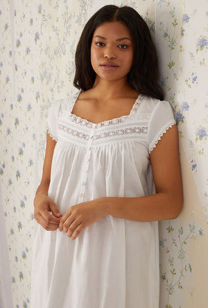 Comfort meet refinement in this 100% cotton gown. The heirloom lace is divine, the pintucks are flattering and the cap sleeves offer just enough coverage. A placket of akoya shell buttons shimmer against the crisp lawn fabric.