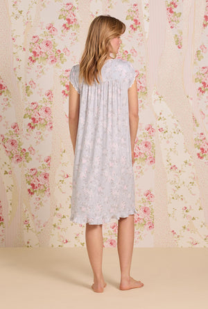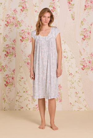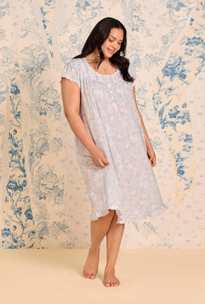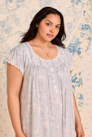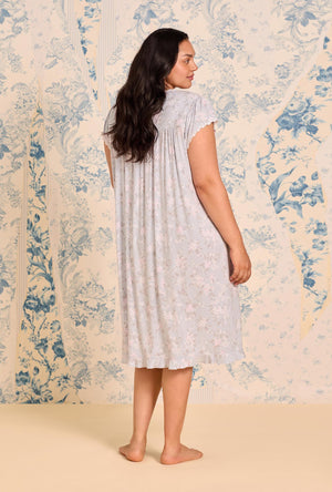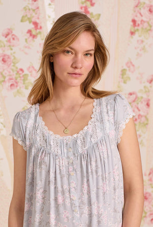A new staple knit in your collection. This classically designed waltz nightgown is made in our cozy modal jersey knit. It features venise floral lace trims along the sweetheart neckline and cap sleeves. At the yoke the delicate venise lace is beaded with a satin ribbon. The button placket consists of vertical pintucking details and round iridescent buttons. Finished with a baby ruffle hem.