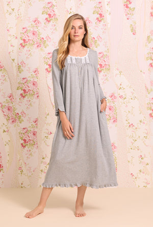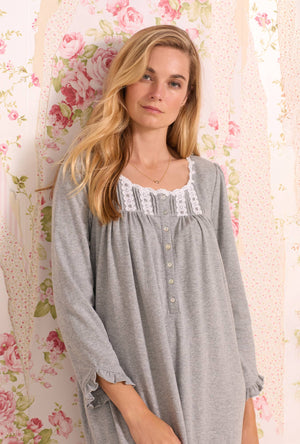 This soft long sleeve ballet gown is designed with cotton rich interlock jersey. The edge lace-trimmed round neckline, the ribbon-beaded floral-patterned lace on the front yoke and the angled ruffled sleeves make this piece so feminine. It is finished with an Akoya shell button placket and a ruffled hemline.