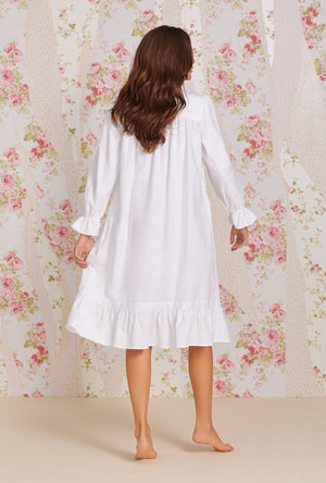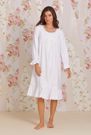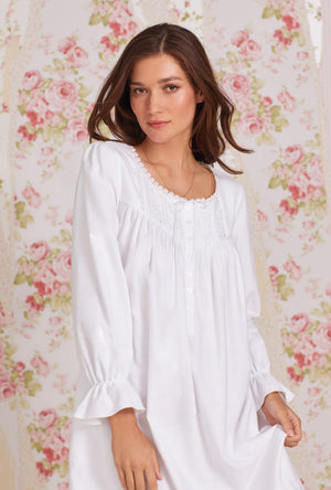 This soft 100% cotton flannel night gown is a staple for cold weather. It features a lace-trimmed round neckline, pintucks and lace on the front yoke, a placket of flower-shaped buttons, side seam pockets and elastic ruffled cuffs. The stunning floral embroidery on both the yoke and above the ruffled hem makes this piece extra special.
