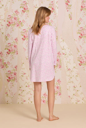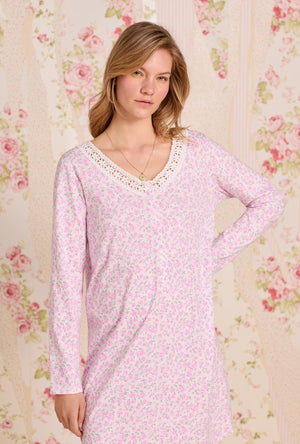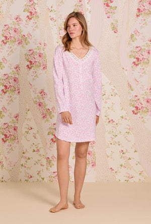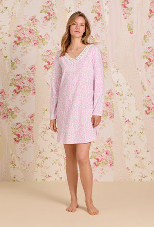 This long sleeve short nightshirt is crafted in the most comfortable cotton jersey knit. This cozy nightshirt features a V-neckline trimmed with venise floral lace. Finished with flower-shaped buttons and a shirt tail hem.