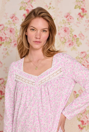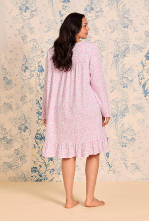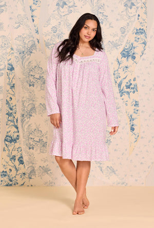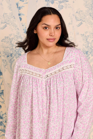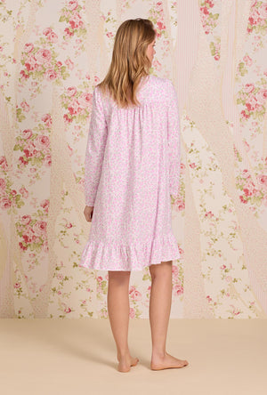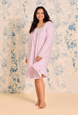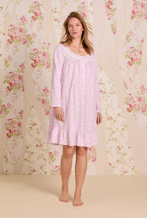 This long sleeve short nightgown is crafted in the most comfortable cotton jersey knit. This nightgown features a classic sweetheart neckline adorned with edge lace. It has inserted venise floral lace and intricate pintucking details at the yoke. Finished with flower-shaped buttons and a ruffled hem.