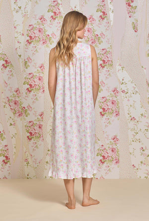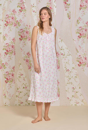 Our classic long sleeveless nightgown made from our cozy cotton jersey knit. This nightgown features fresh & feminine design… the sweetheart neckline is trimmed with dainty venise floral lace that is beaded with a darling satin ribbon. The yoke consists of pintucking details followed by inserted embroidered lace. Finished with akoya round buttons and a baby ruffle hem.
