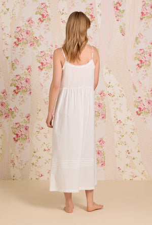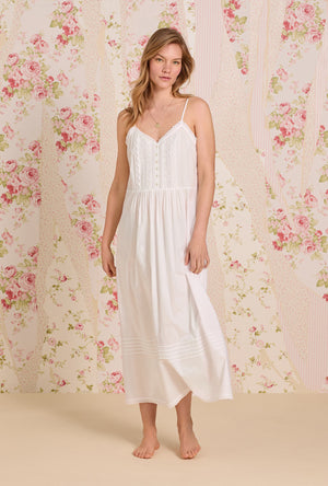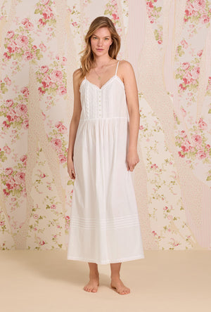Our new modern strappy ballet nightgown is made in our best cotton yarn dye chambray. Fresh eyelet lace trims the sweetheart neckline and hemline of the nightgown. The button placket is complete with eyelet lace inserts, vertical pintucking details, and round Akoya shell buttons.