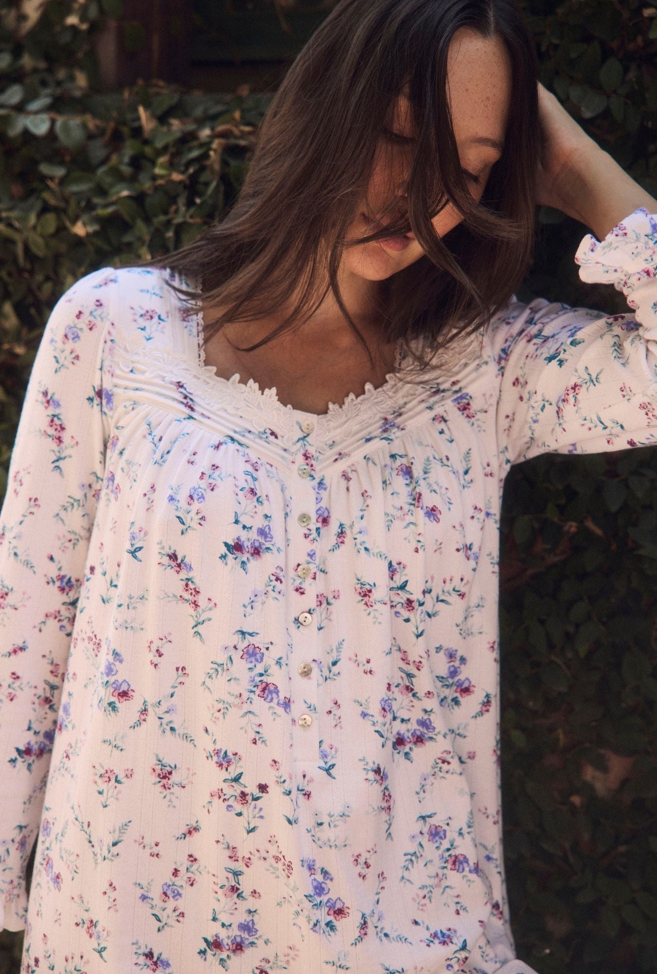 A clean and classic look, this 100% cotton nightgown is designed with a delicate dobby stripe, accented by venise lace at the neckline, pintucks at the neckline and skirt, and a placket of akoya shell buttons.