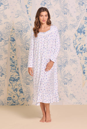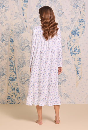 A gentle caress of comfort, this long sleeve nightgown is crafted from breathable, softly brushed cotton peached jersey. A sweetheart neckline with Venise edge lace adds charm, while floral Venise lace beaded with satin ribbon lends an heirloom touch. Akoya shell buttons glisten with subtle beauty. Long sleeves provide gentle coverage, while the softly ruffled hem completes the silhouette with timeless femininity. Breathable and lightweight, it invites comfort into every quiet evening.