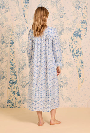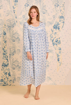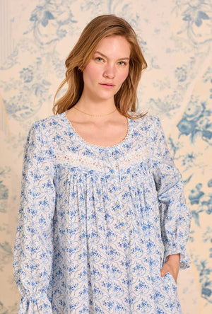 A flawless cotton lawn classic nightgown for everyday wear. This exquisite gown features intricate edge lace details beaded with a satin ribbon at the round neckline. Other design details include floral venise lace and pintucking details at the yoke. Finished with round Akoya shell buttons and a straight hem.