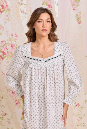 A portrait of timeless elegance, this long nightgown is crafted from our finest 100% Cotton Woven Lawn. Whisper-soft and endlessly graceful. The long sleeves lend gentle coverage, while a sweetheart neckline trimmed with delicate edge lace adds a touch of vintage charm. Across the yoke, beaded Venise floral lace glistens with heirloom beauty, further adorned with a velvet ribbon tied in a demure bow. The button placket glimmers with round Akoya shell buttons, while pintucks lend quiet texture and refinement. Finished with a softly ruffled hem, this gown is a tribute to femininity made to be treasured.