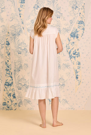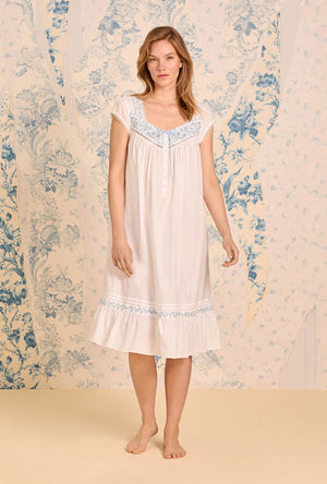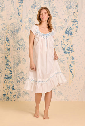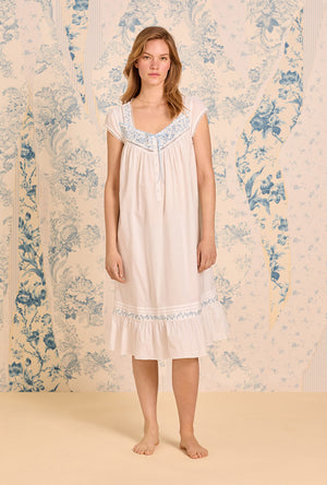 A flawless cotton lawn classic nightgown for everyday wear. This exquisite gown features intricate edge lace details beaded with a satin ribbon at the round neckline. Other design details include floral venise lace and pintucking details at the yoke. Finished with round Akoya shell buttons and a straight hem.