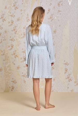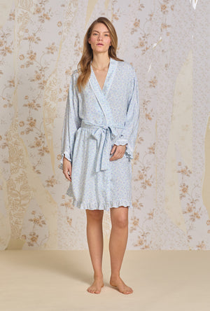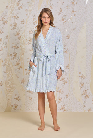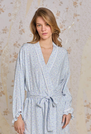 Our most comfortable lightweight robe is crafted in silky EcoVero Woven Rayon. It features a sleek shall collar with a belted wrap tie front. The robe is embellished with floral edge lace details. The long sleeves and hem of the robe are finished with a sweet baby ruffles.