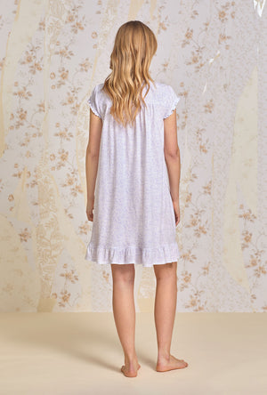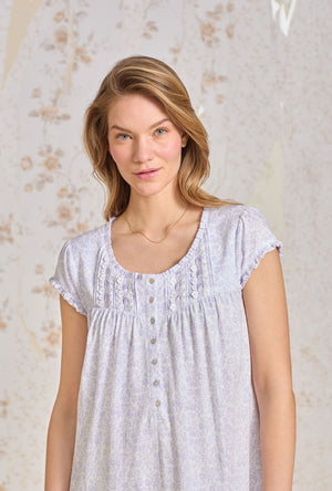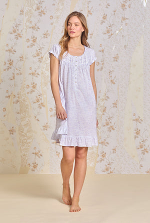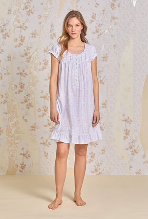 A sweet cap sleeve short nightgown made in cozy Cotton Jersey Knit. Features a round neckline with baby ruffles. The yoke is adnorned with venise floral lace beaded with a satin ribbon , floral Akoya shell buttons, and vertical pintucking details. Finished with a ruffled hem.