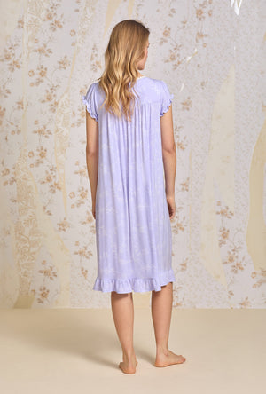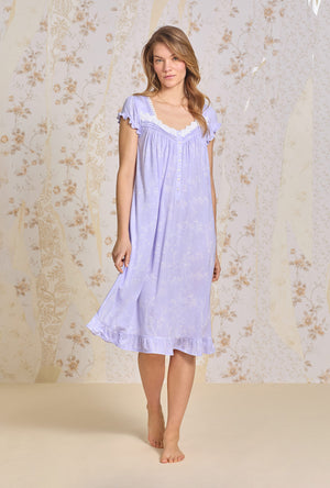 A romantic cap sleeve nightgown fit for an restful summer evening. Crafted in cozy Cotton Jersey Knit. This nightgown features delicate edge ruffles along the sweetheart neckline and venise floral lace that is beaded with satin ribbon. The button placket is embellished with floral Akoya shell buttons. Finished with a ruffled hem.