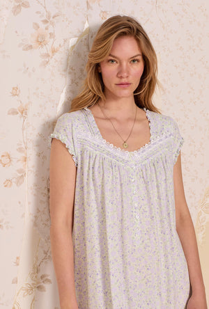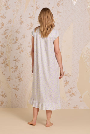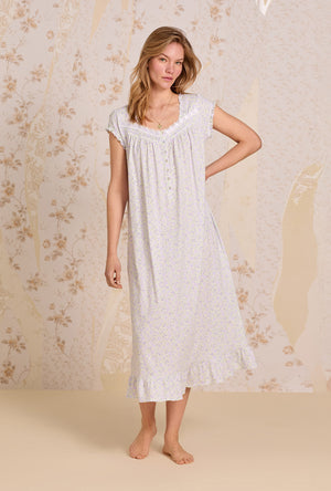 A romantic cap sleeve nightgown fit for an restful summer evening. Crafted in cozy Cotton Jersey Knit. This nightgown features delicate edge ruffles along the sweetheart neckline and venise floral lace that is beaded with satin ribbon. The button placket is embellished with floral Akoya shell buttons. Finished with a ruffled hem.