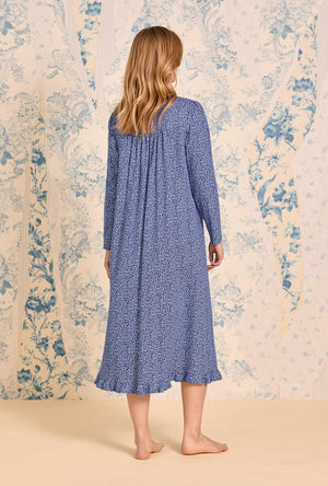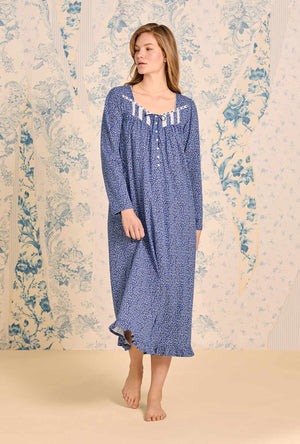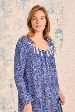 A classic gown with romantic flare. This lovely long sleeve nightgown features a sweetheart neckline with delicate venise floral lace details beaded with a satin ribbon. The button placket features flower-shaped buttons and vertical pintucking details. Finished with a ruffled hem.