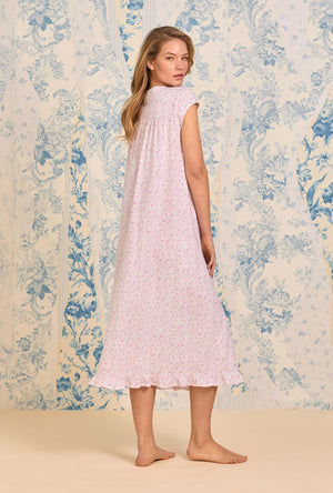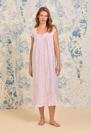 This sweet cap sleeve nightgown is crafted in our soft 100% cotton jersey knit. This lovely style features fresh eyelet edge lace along the sweetheart neckline. At the yoke vertical pintucking details embellished with beaded eyelet embroidered lace trim with a satin ribbon. Finished with Akoya floral buttons and a baby ruffled hem.