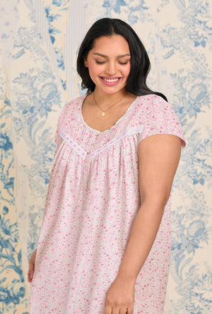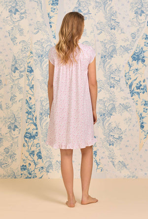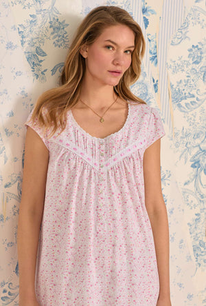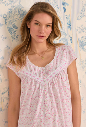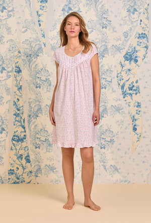 This short and sweet cap sleeve nightgown is crafted in 100% cotton jersey knit. This lovely style features fresh eyelet edge lace along the round neckline. At the yoke vertical pintucking details embellished with low beaded eyelet embroidered lace trim with a satin ribbon. Finished with Akoya floral buttons and a baby ruffled hem.