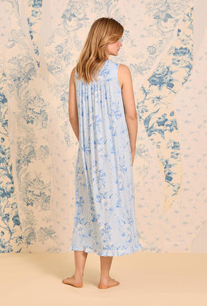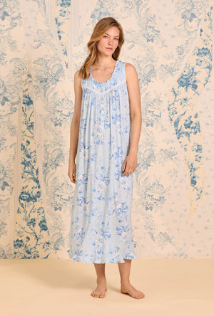 A new modal knit classic. This timeless "Eileen" nightgown features baby ruffle details at the round neckline. The yoke placket consists of vertical pintucking, thin venise floral lace trim, and floral Akoya shell buttons. Finished with a ruffled hem.
