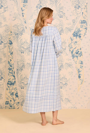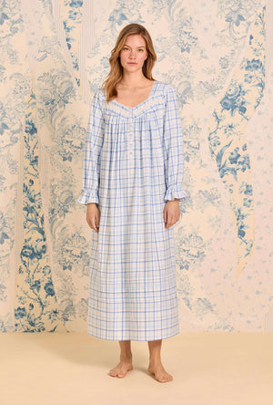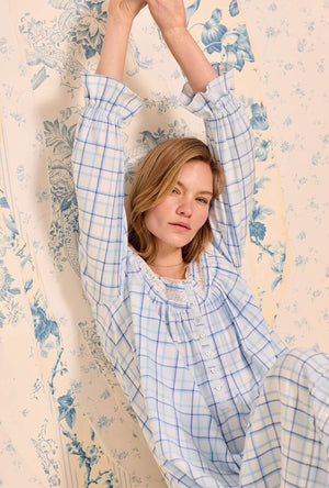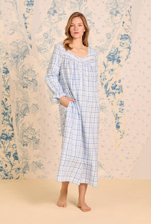 A cozy cotton brushed flannel nightgown for everyday wear. This long sleeve nightgown features delicate edge lace details at the sweetheart neckline. Inserted venise floral lace at the yoke placket that is embellished with lovely round Akoya shell buttons and vertical pintucking details. Finished with a straight hem.