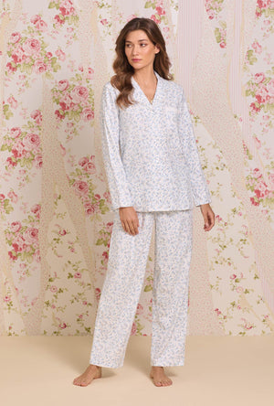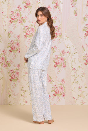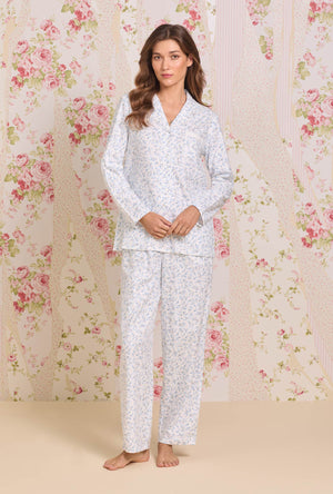 A dream of softness and warmth, this long sleeve PJ set is crafted in 100% Cotton Brushed Flannel. The top features long sleeves and a notch collar trimmed with edge lace details, complemented by a full button front of round Akoya buttons and a chest pocket adorned with floral Venise lace details. The pants include an elasticized waist for extra comfort, side seam pockets, and a drawstring closure, offering effortless ease and timeless style.