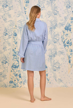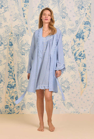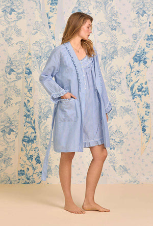 Cute & cozy… This short wrap robe is crafted in our best 100% cotton dobby stripe woven yarndye. Features baby ruffle trim along the shall neckline. Finished with long sleeves with daisy chain piping details on the cuffs and front patch pockets.