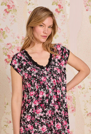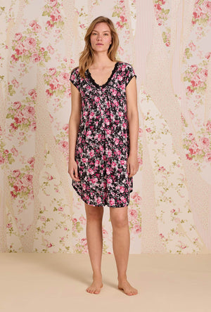 This silky soft sleepshirt is made of Tencel Modal jersey. It features a V-neckline embellished with pintucks and floral-pattern lace, edge lace on sleeve openings and a placket of Akoya shell buttons. It is finished with a shirt-tail hem.