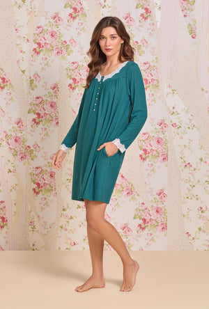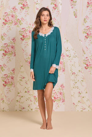This soft sweater knit short nightgown is a staple for cold weather. Gorgeous 2" embroidered lace trims the V-neckline and sleeve openings. It is finished with stunning shirring details across the front yoke and an Akoya button placket.
