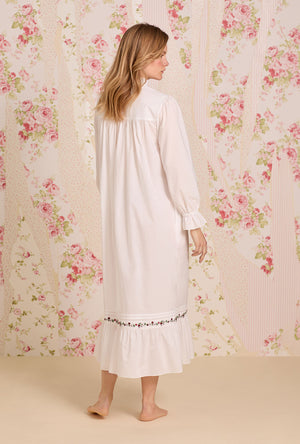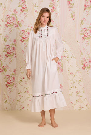 A graceful interpretation of timeless femininity, this antique-inspired nightgown is crafted from our finest 100% Cotton Woven Lawn, soft, breathable, and endlessly elegant. Long sleeves provide gentle coverage, while a delicate stand collar trimmed with baby ruffles evokes vintage charm. The yoke is adorned with dreamy floral embroidery and shimmering floral Akoya shell buttons, each detail a whisper of heirloom beauty. Finished with elegant pintuck details and floral embroidery above the softly ruffled hem, this gown invites serenity and grace into every quiet moment.