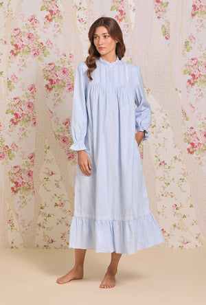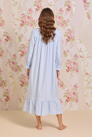 This soft 100% cotton flannel night gown is a staple for cold weather. It features a lace-trimmed sweetheart neckline, a placket of flower-shaped buttons, side seam pockets and elastic ruffled cuffs. The stunning floral embroidery on the yoke and above the ruffled hem makes this piece extra special.