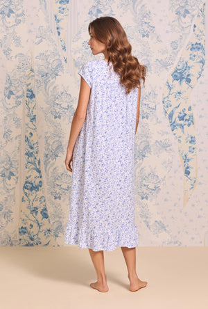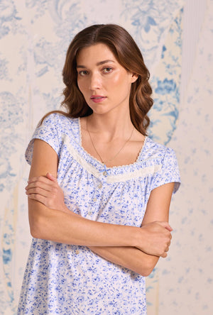 A gentle caress of comfort, this long cap sleeve nightgown is crafted from breathable, softly brushed cotton peached jersey. A sweetheart neckline with Venise edge lace adds charm, while delicate pintucks and beaded floral Venise lace with satin ribbon at the yoke lend an heirloom touch. Akoya shell buttons glisten with subtle beauty. Cap sleeves and a softly ruffled hem complete the silhouette with timeless femininity. Breathable and lightweight, it invites comfort into every quiet evening.
