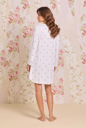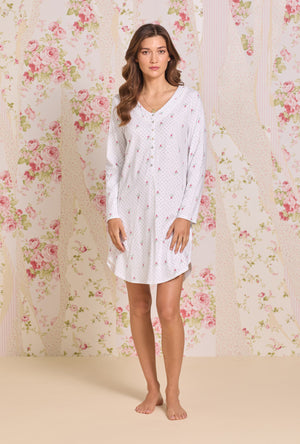 A whisper of softness, this nightshirt is crafted in 100% Cotton Peached Jersey, perfect for a restful evening. The v-neckline is adorned with floral Venise lace and pinched pleats, lending a delicate charm. The button placket is designed with floral Akoya buttons, and the shirt-tail hem adds a final flourish of elegance.